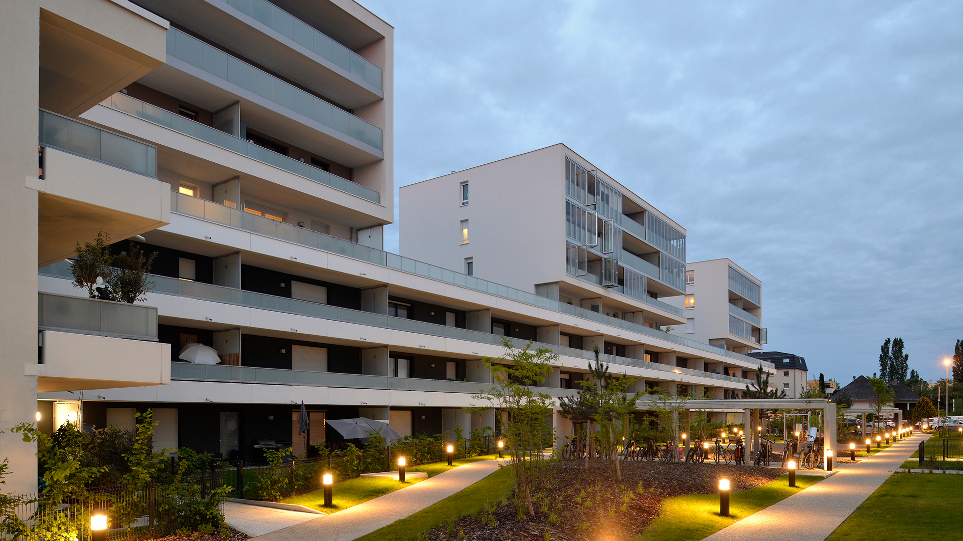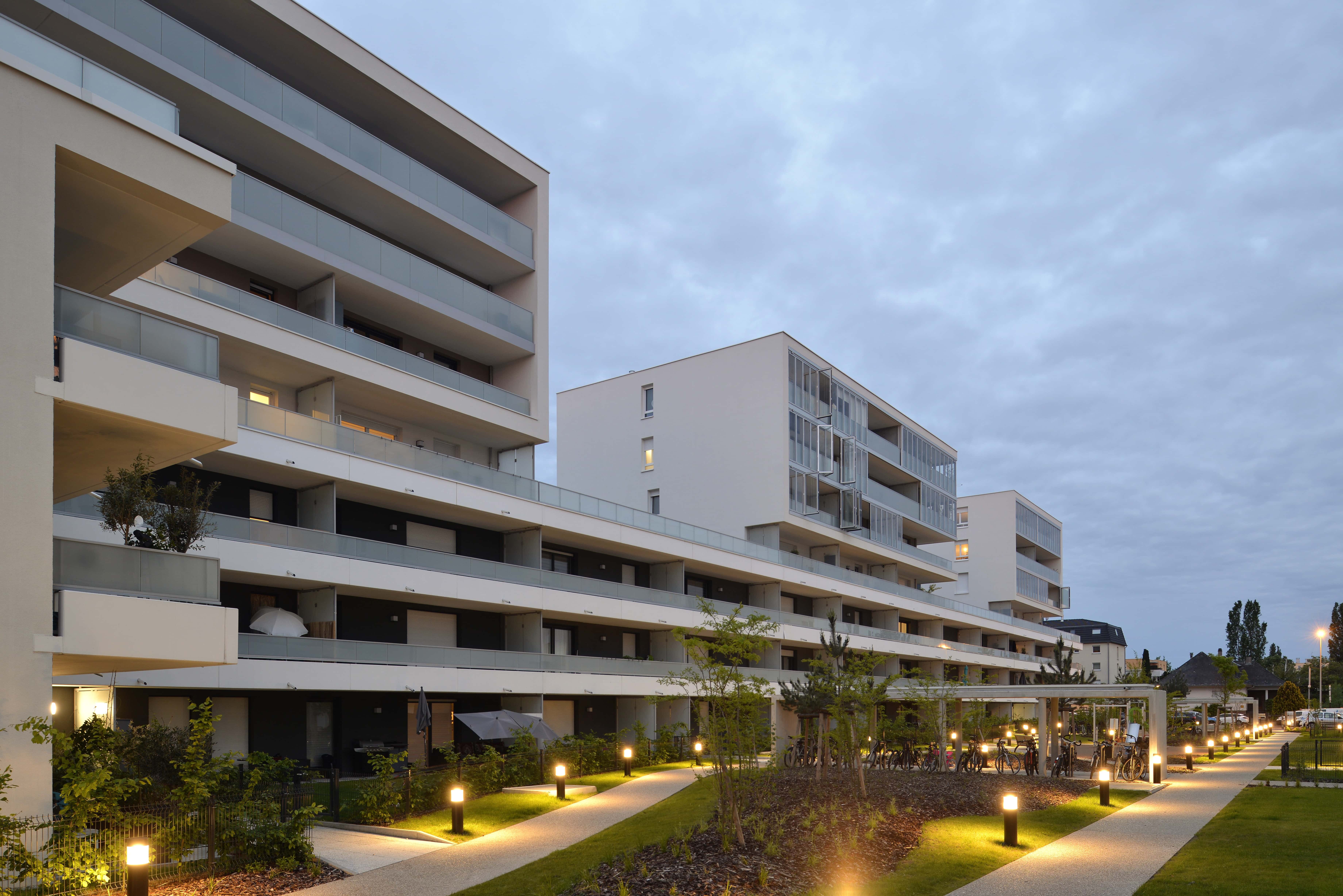 Le projet KRYSTAL comprend 208 logements répartis sur 6 bâtiments principaux (R+6/R+5+attiques) et 2 ensembles intermédiaires R+2. Parc central paysagé, cœur d’îlot en pleine terre, stationnements majoritairement en sous-sol, terrasses ou jardins généreux. Vues, circulation de l’air et jardins d’hiver bioclimatiques intégrés.