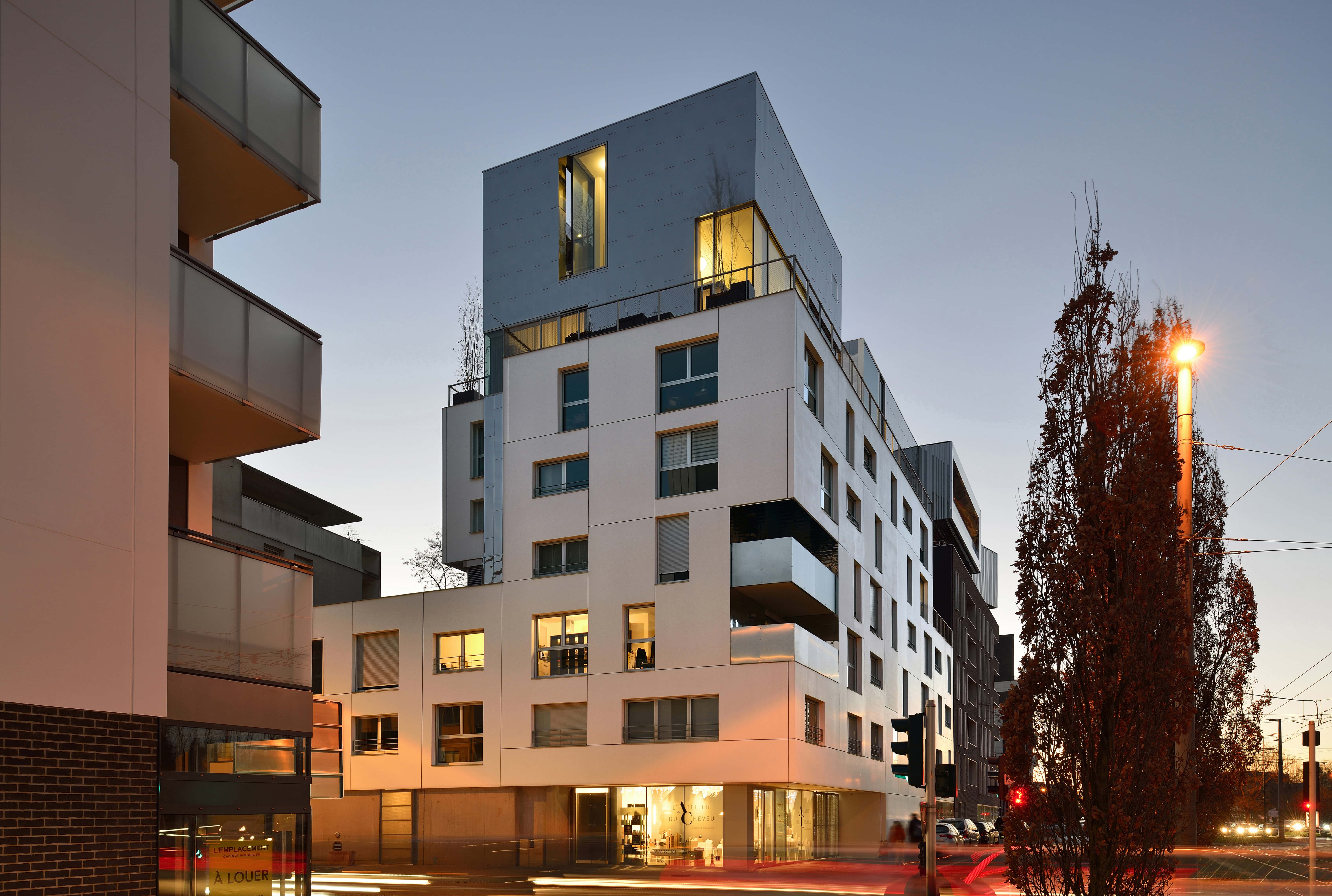 Construction de 34 logements et de deux locaux d’activités. La façade nord en béton poli blanc offre pérennité et modernité, ouverte sur un cœur d’îlot verdoyant. Façade sud rythmée par de larges terrasses et attique en inox. Projet valorisant confort, lumière et qualité de vie des habitants.
