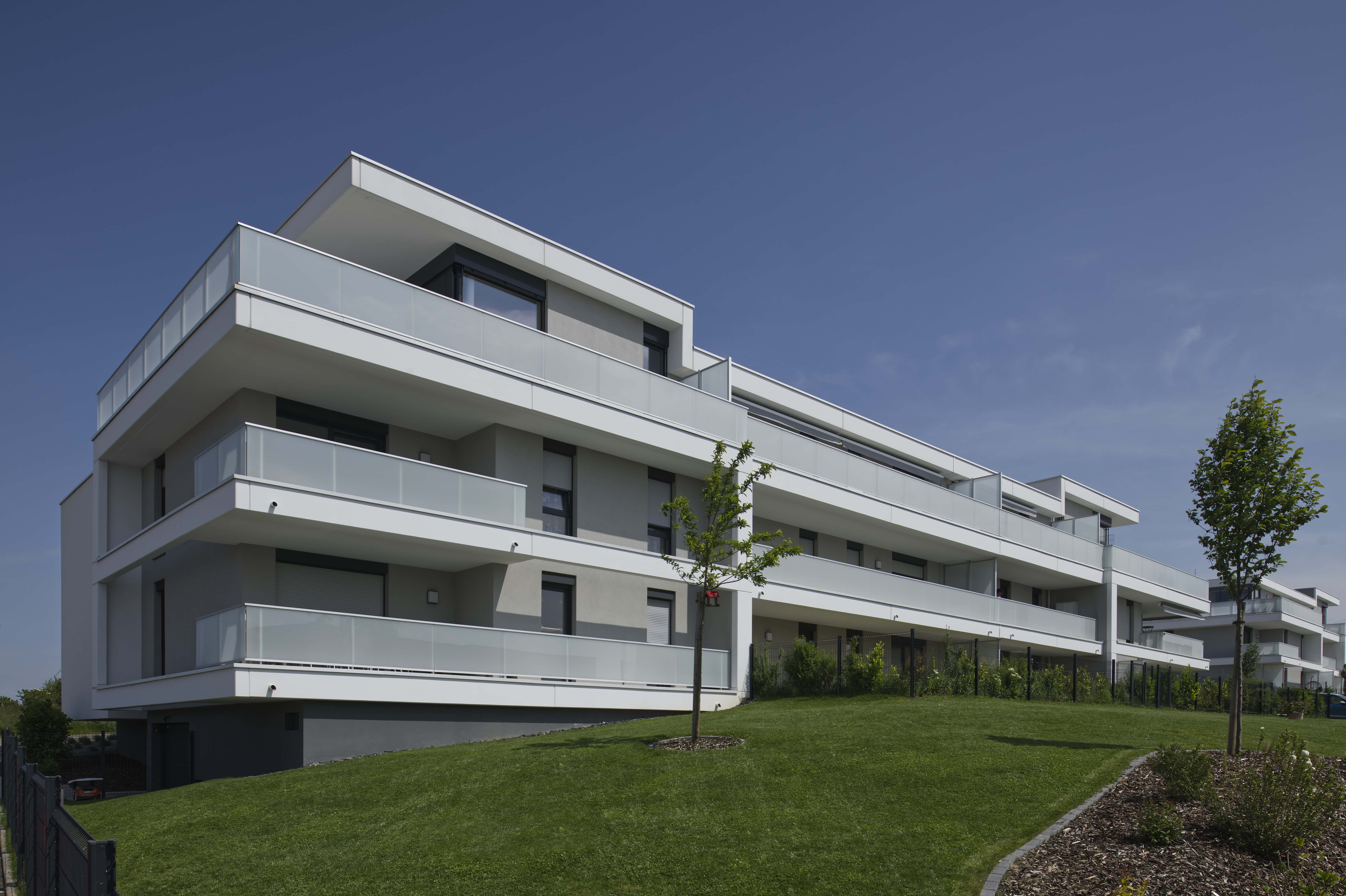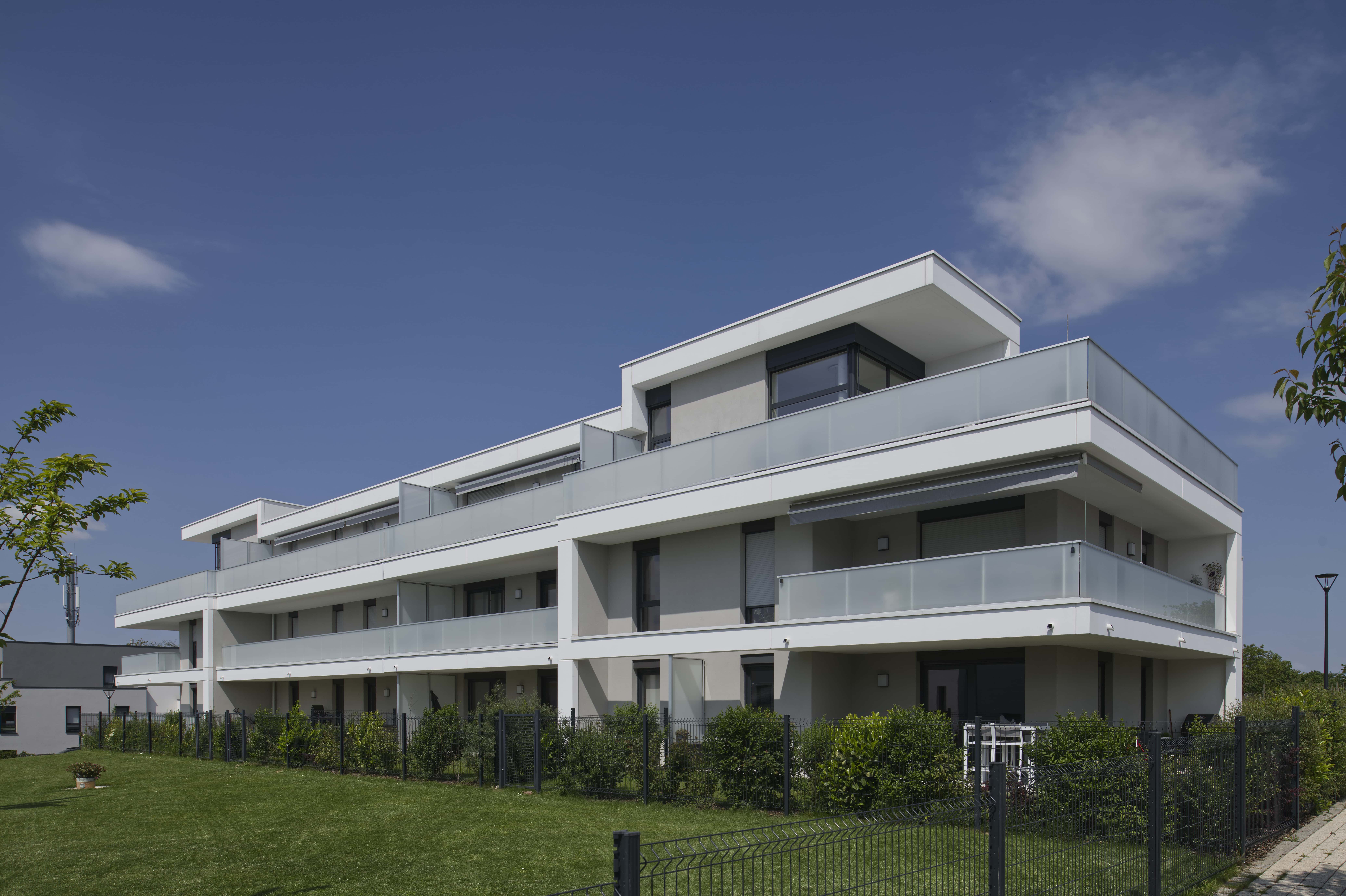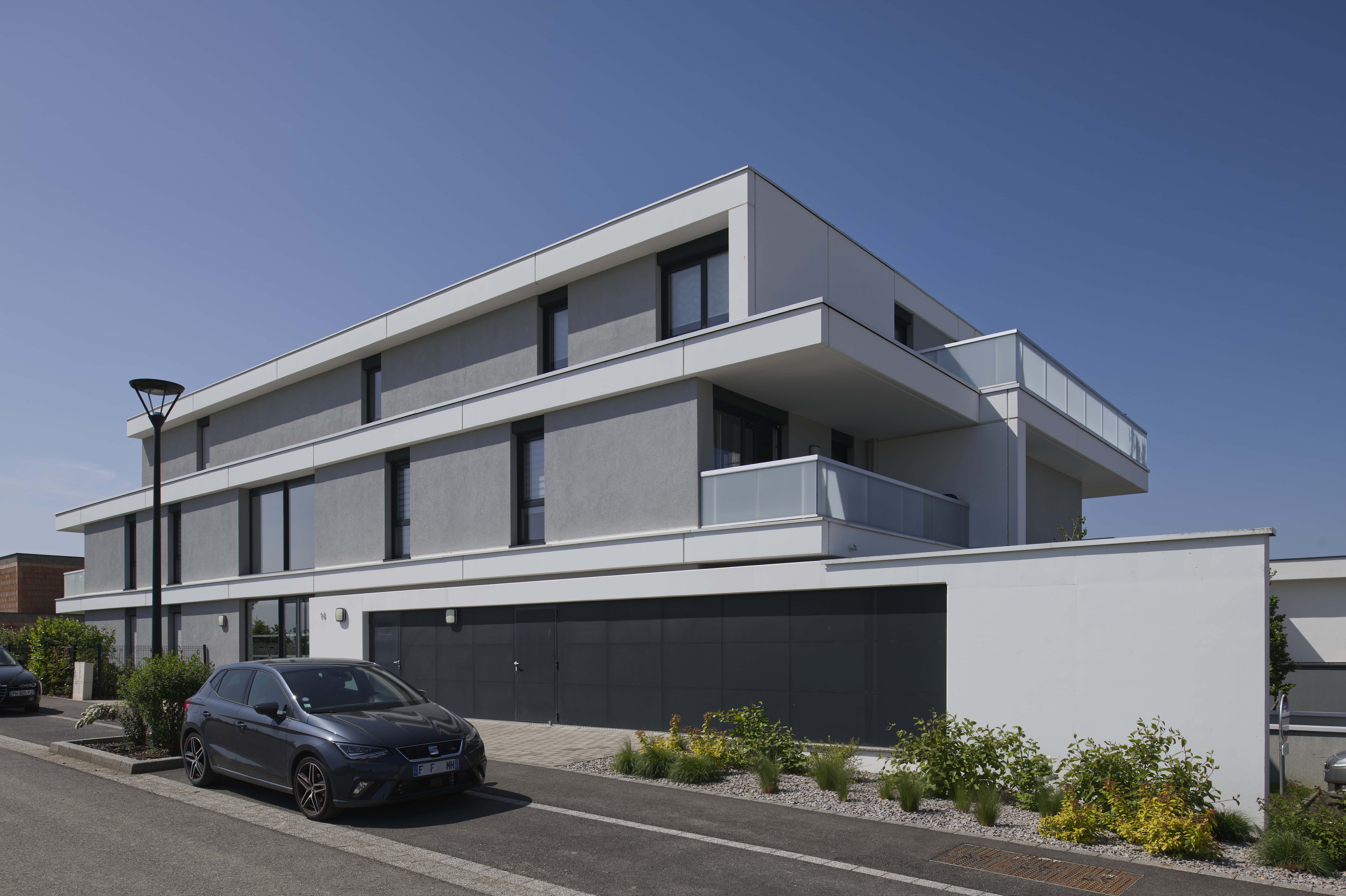 Ensemble immobilier de 31 logements en 2 immeubles R+1+attiques (20 et 11 logements) avec 60 places de stationnement (sous-sol et aérien). Diversité des attiques, prolongements extérieurs variés et traitement qualitatif des halls et espaces communs.