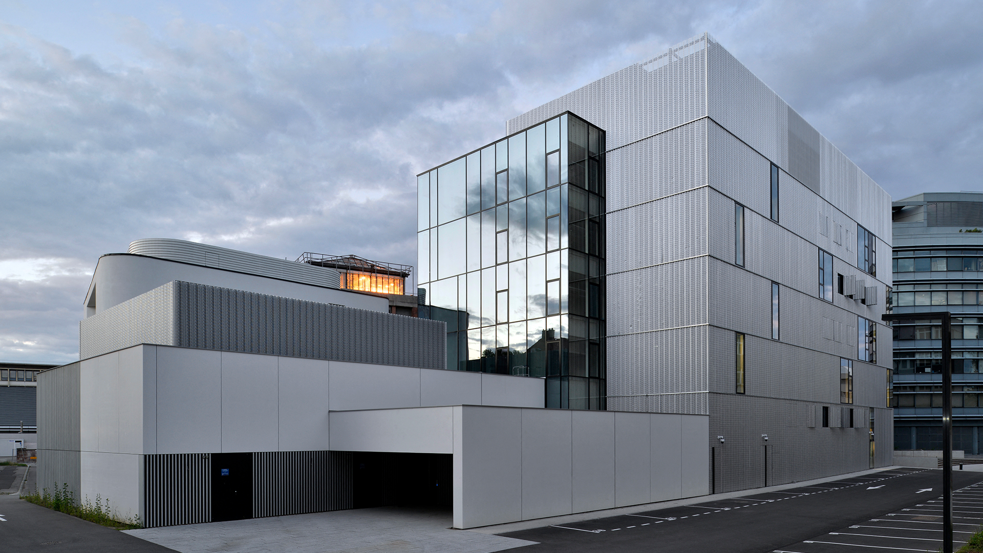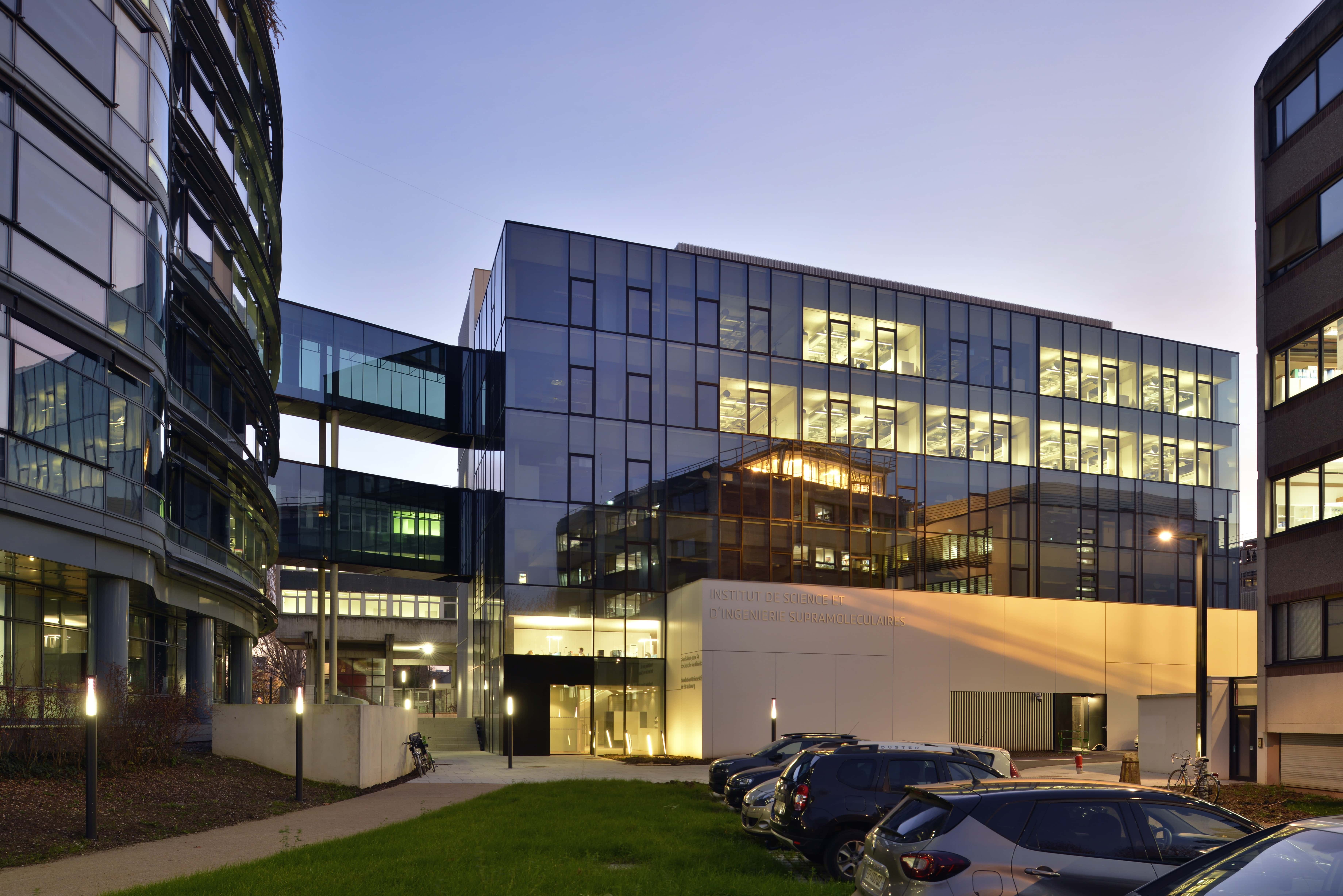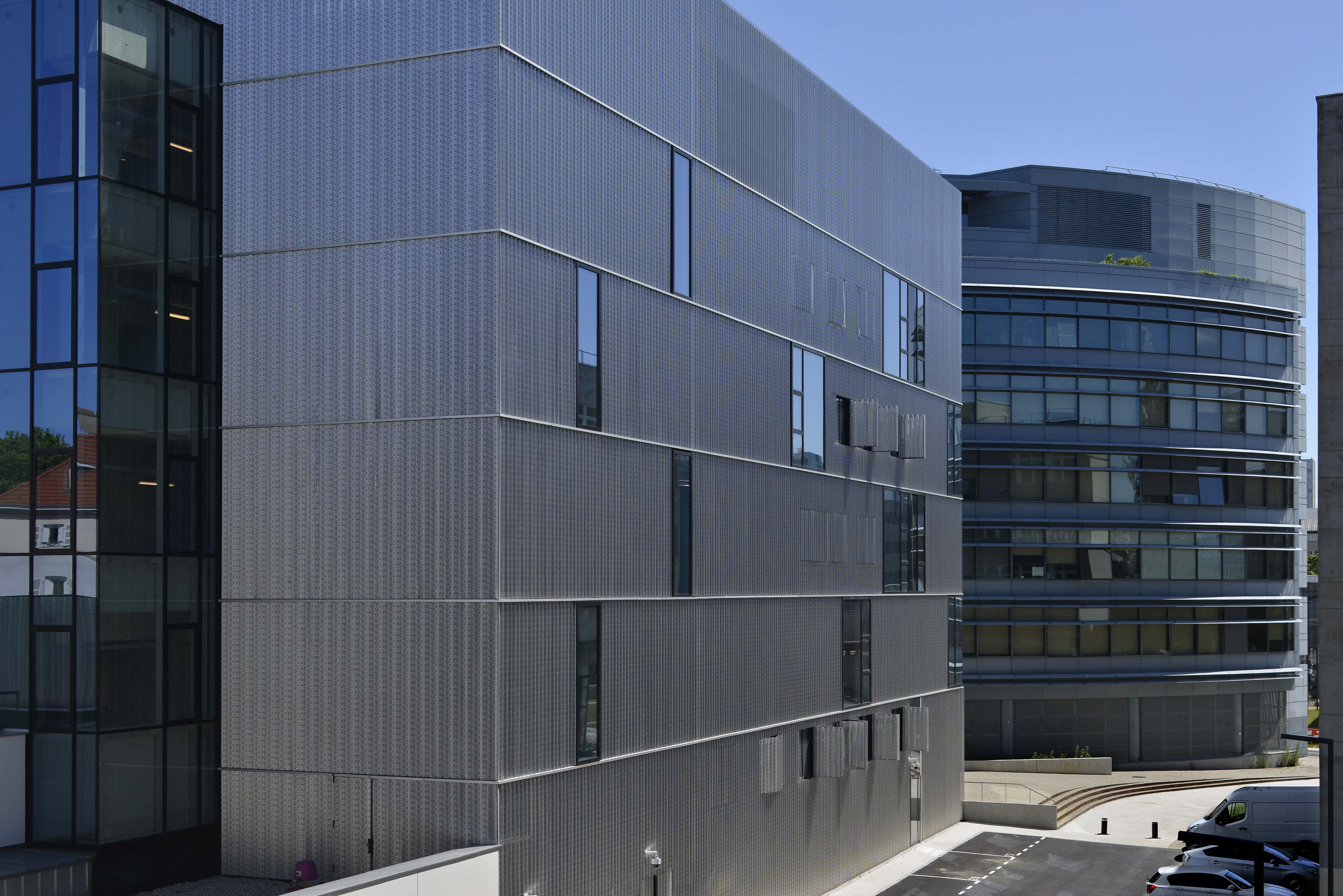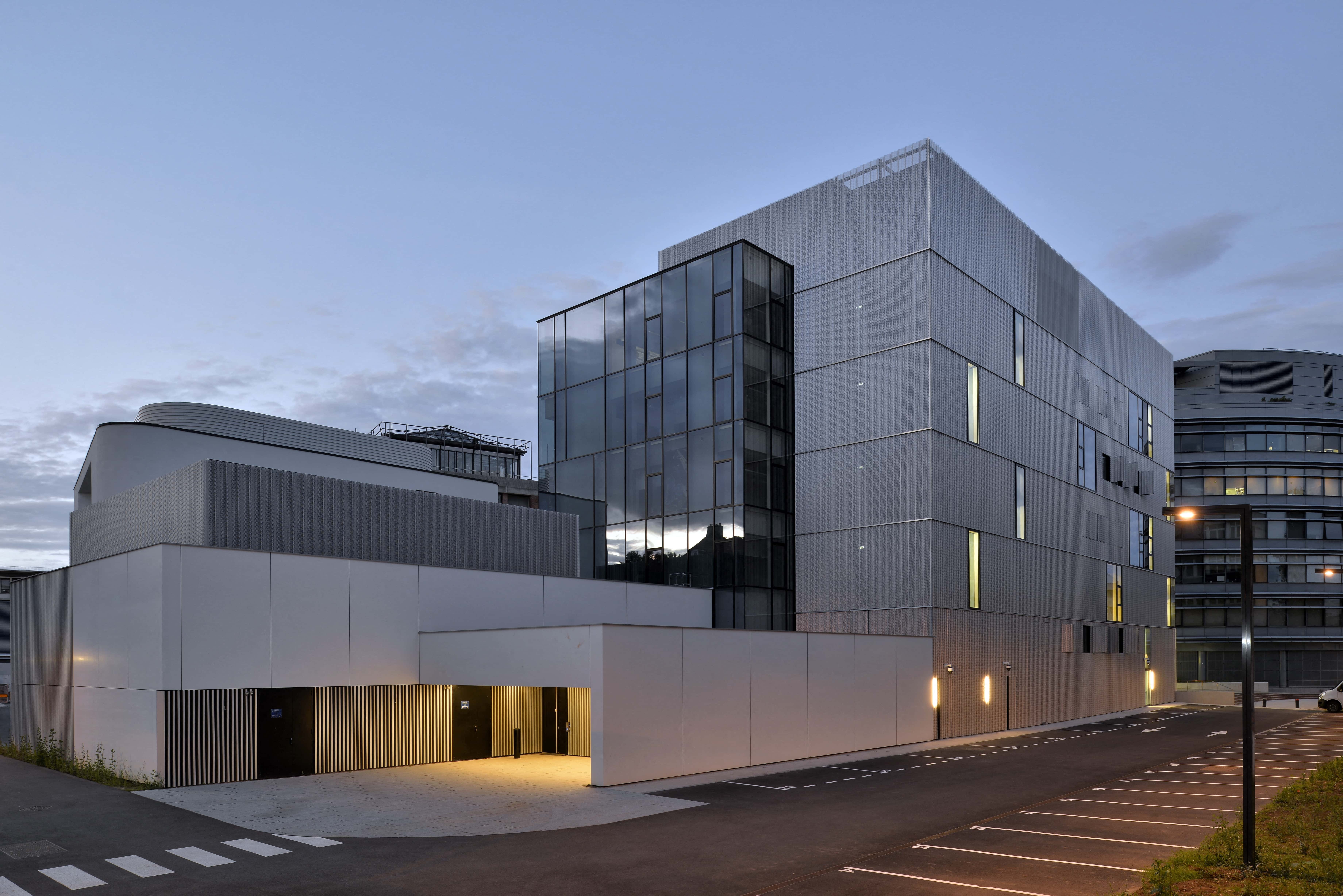 Au cœur du campus de l’Université de Strasbourg, le projet rassemble les laboratoires de l’ISIS, les bureaux de la fondation universitaire et un Datacenter de haute sécurité au sein d’un programme hybride. L’architecture traduit cette diversité par une composition lisible : un volume vitré au nord pour les laboratoires, un ensemble plus opaque au sud pour les bureaux et locaux techniques, et un socle minéral à l’ouest abritant stockage et Datacenter. Conçu pour 110 baies, ce dernier se distingue par une performance énergétique exemplaire, récompensée par le EU Code of Conduct for Data Centres Award 2019.