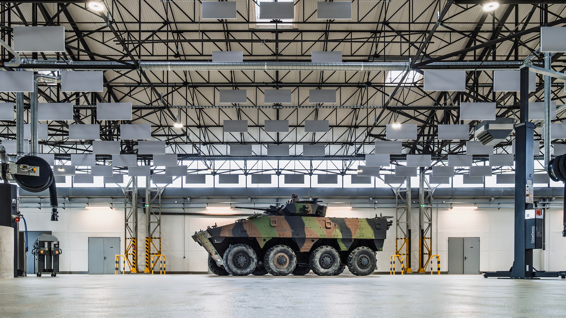 Réhabilitation du hangar HM5 pour atelier mécanique de véhicules blindés. Intégration de puits de lumière, nouvelles portes sectionnelles, création d’un bâtiment de stockage (120 m²) et bassins de rétention/infiltration.