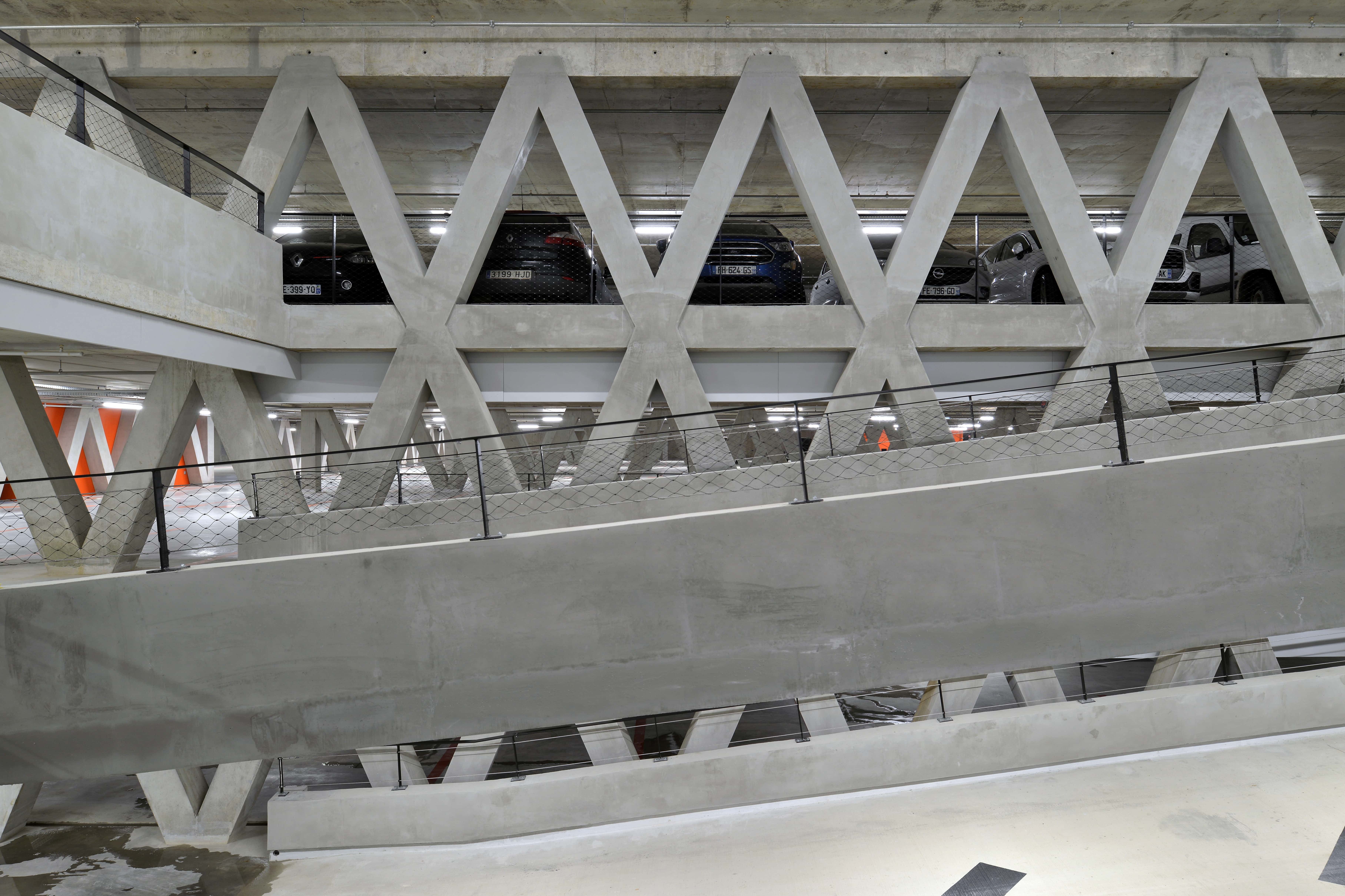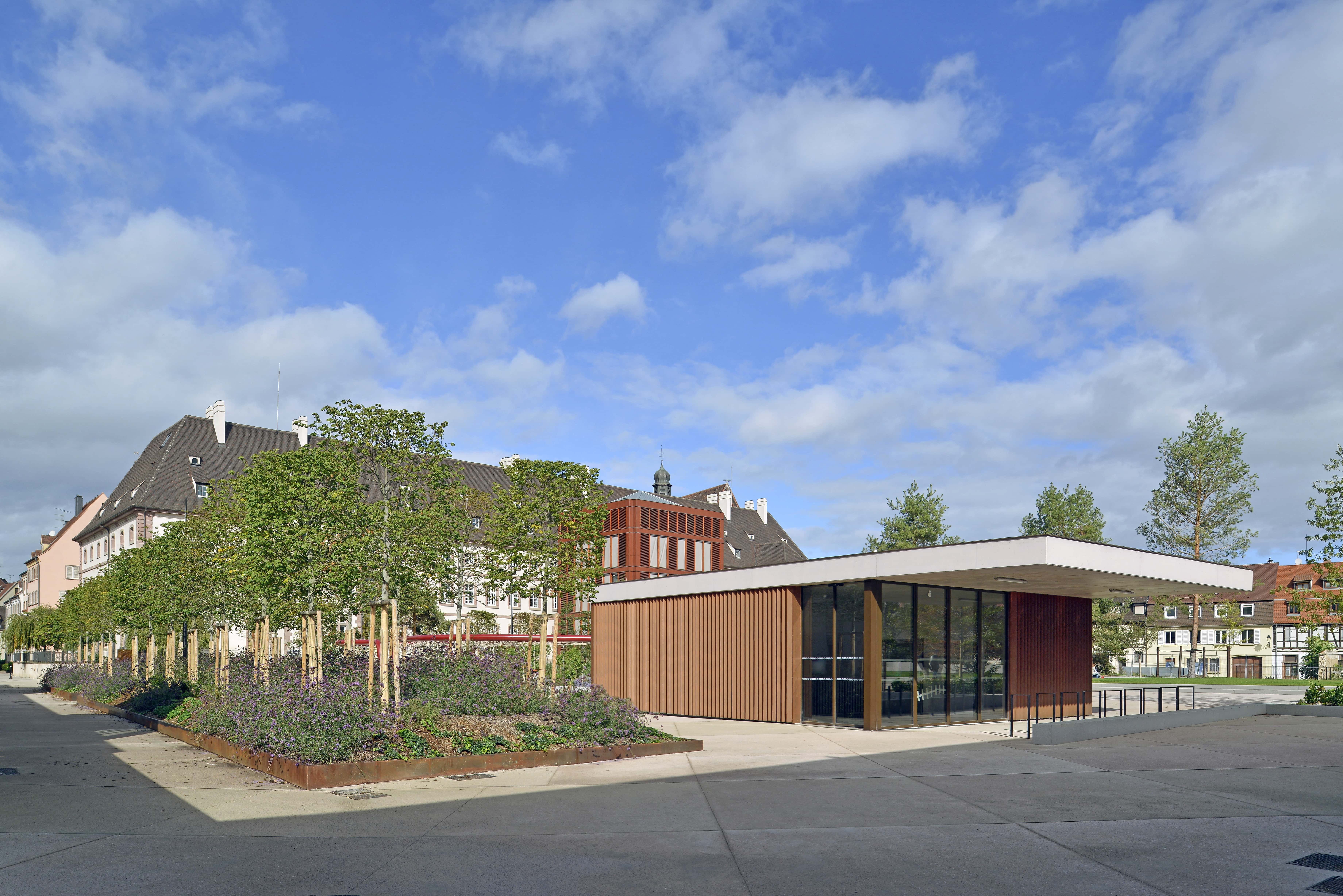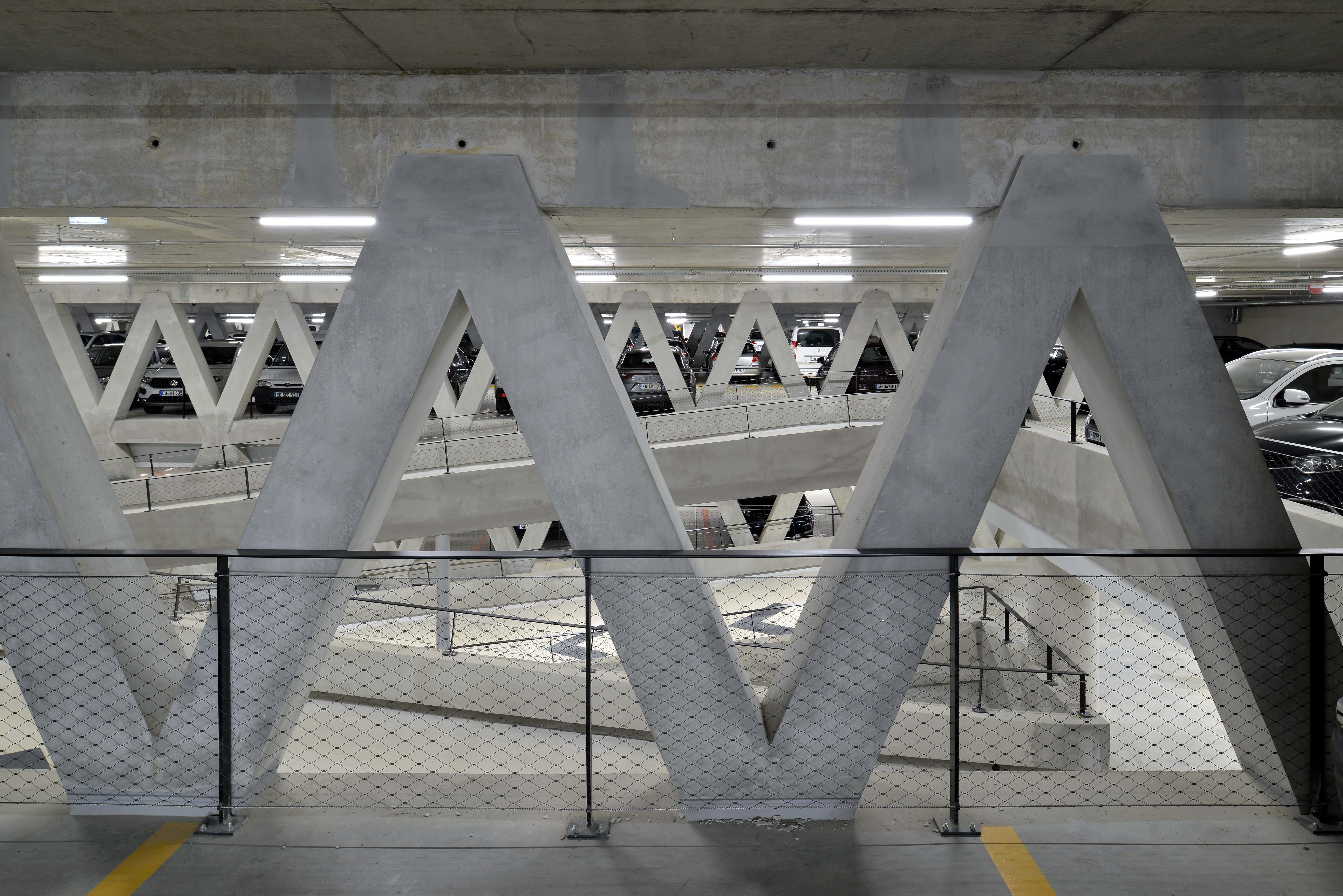 Le site de la Montagne Verte à Colmar, à proximité immédiate du centre historique, fait l’objet d’un projet associant stationnement et requalification urbaine. L’aménagement paysager privilégie des cheminements fluides et des continuités végétales, valorisant le mur d’enceinte de Specklin et la douve, marquant l’entrée symbolique du parc par une passerelle. Le projet comprend un parking souterrain de trois niveaux offrant 710 places, organisé de manière simple et lisible pour le confort et la sécurité des usagers. En surface, l’ouvrage reste discret, avec des façades en cuivre, conciliant intégration patrimoniale, fonctionnalité et qualité d’usage.