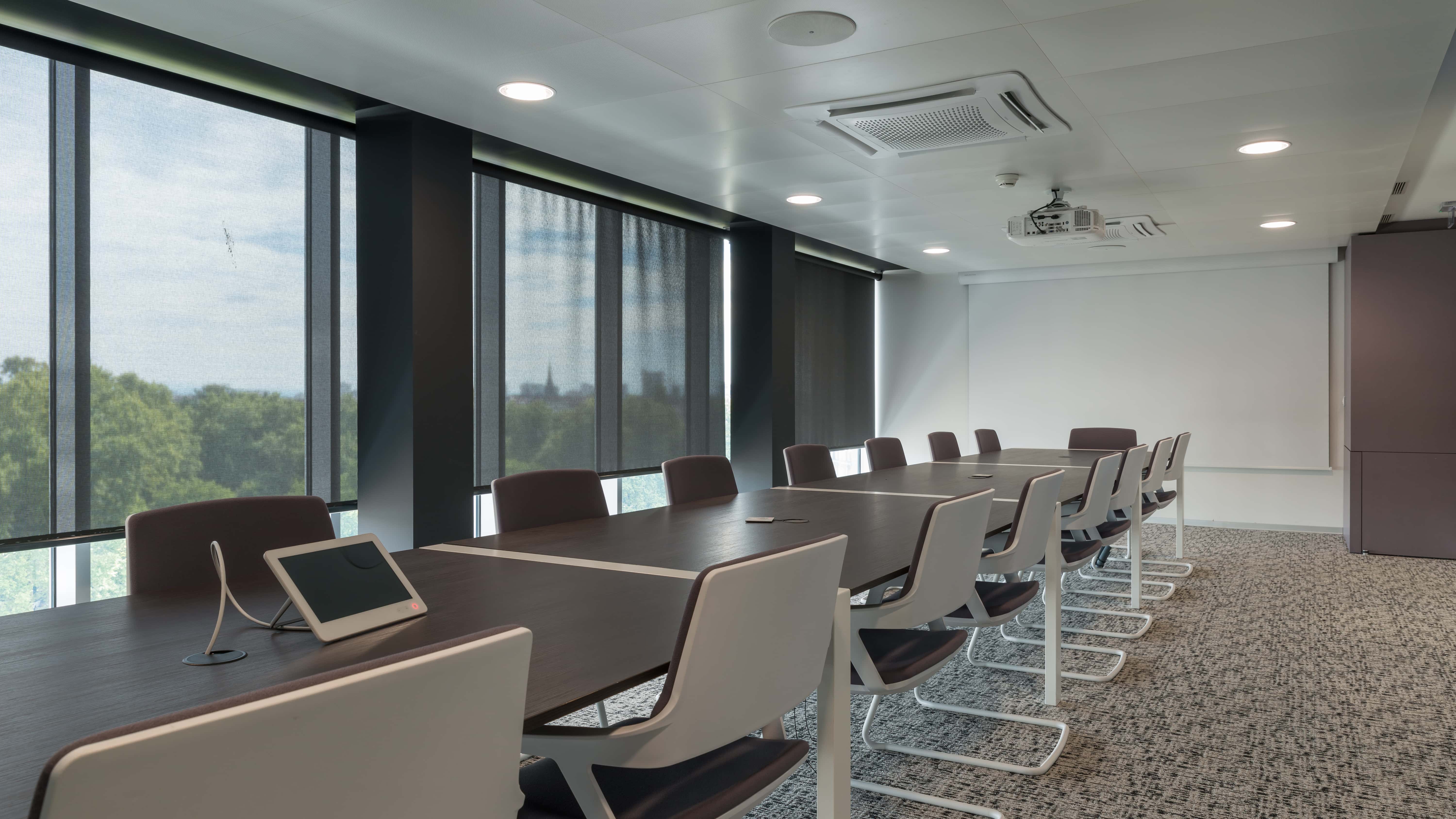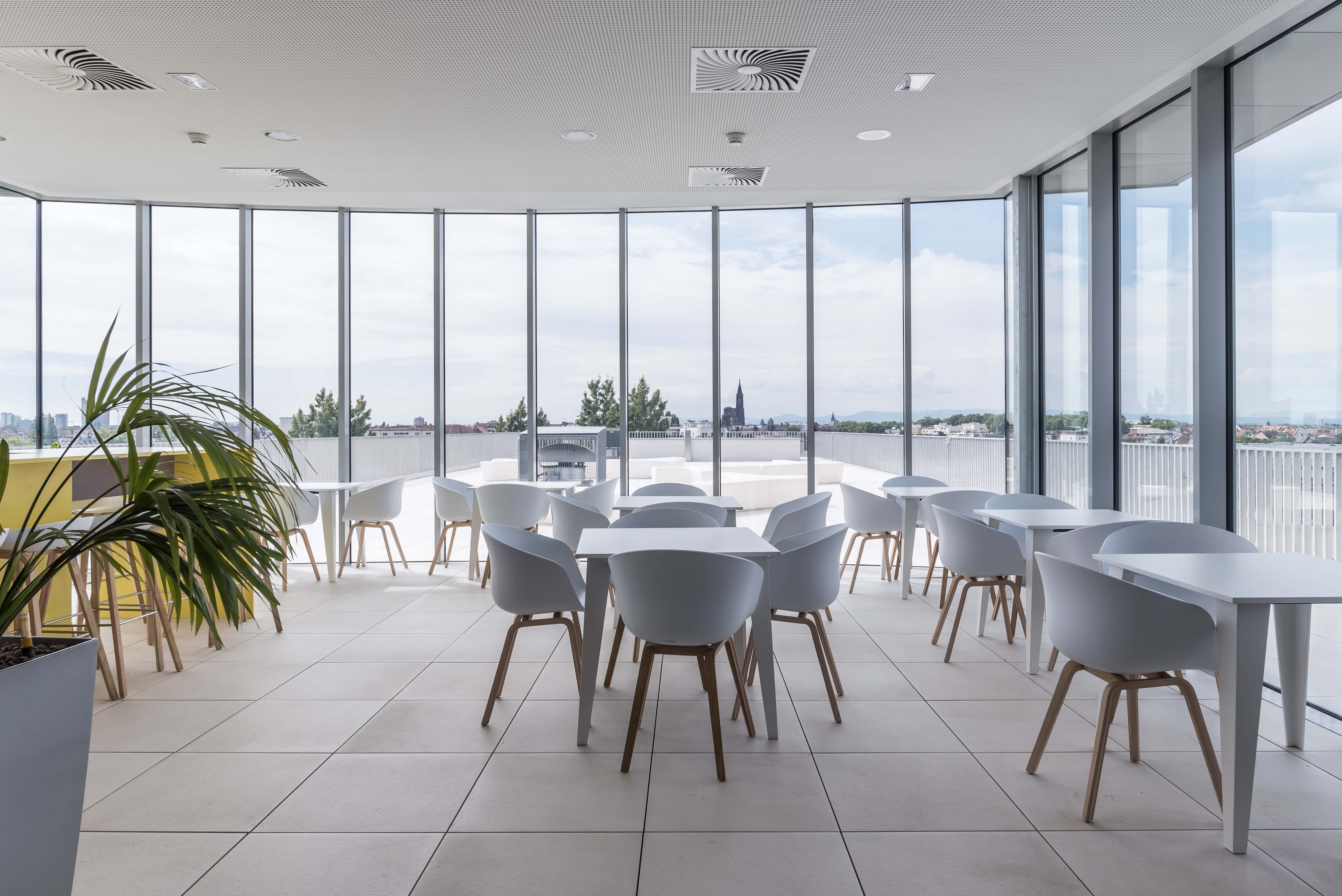 Restructuration d’un bâtiment de bureaux en site occupé, avec mise en conformité sismique, incendie et PMR. Façades équipées de brise-soleil, hall et cage d’escalier en béton poli blanc, liaison vitrée avec bâtiment Pierre Pflimlin pour cohérence fonctionnelle.