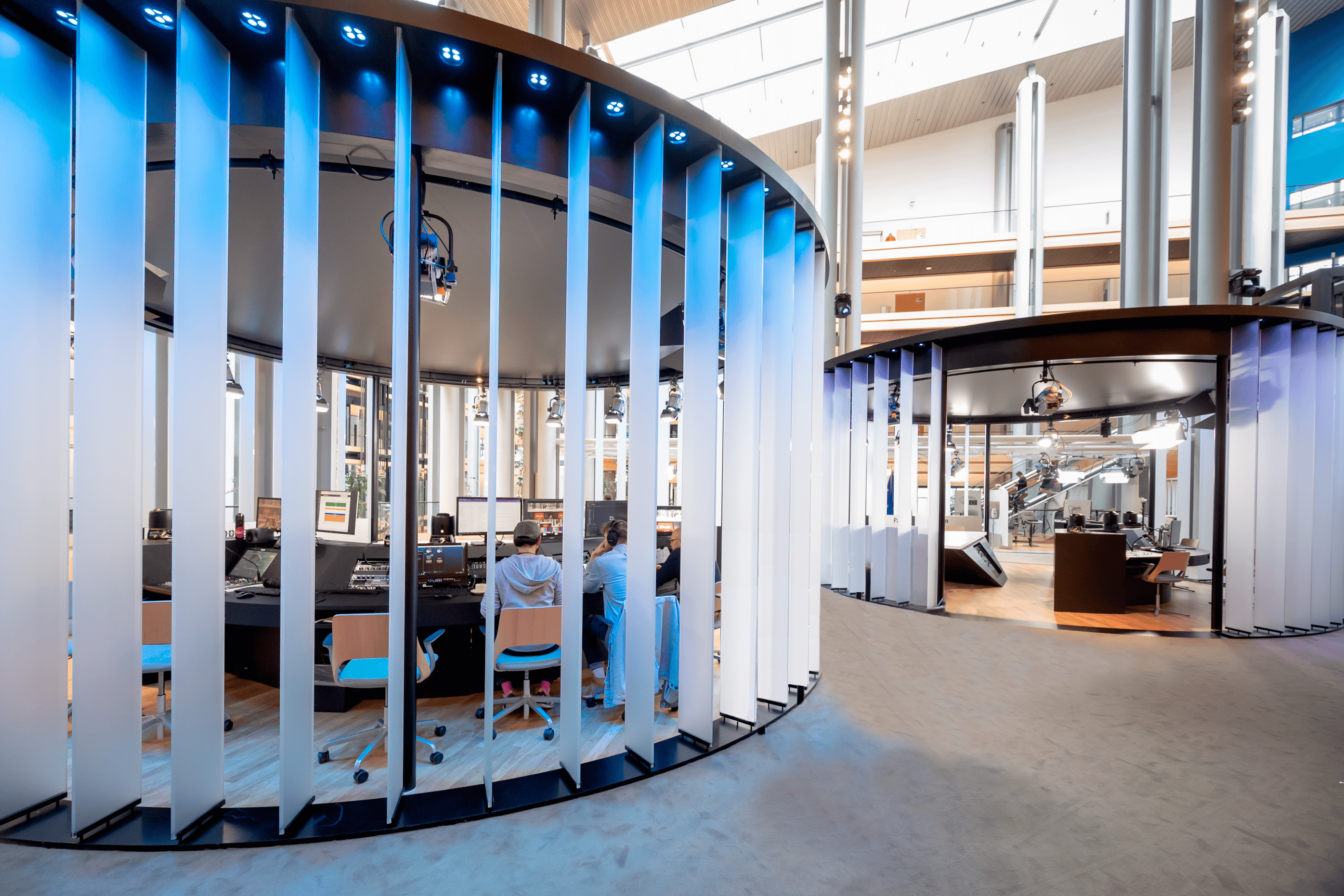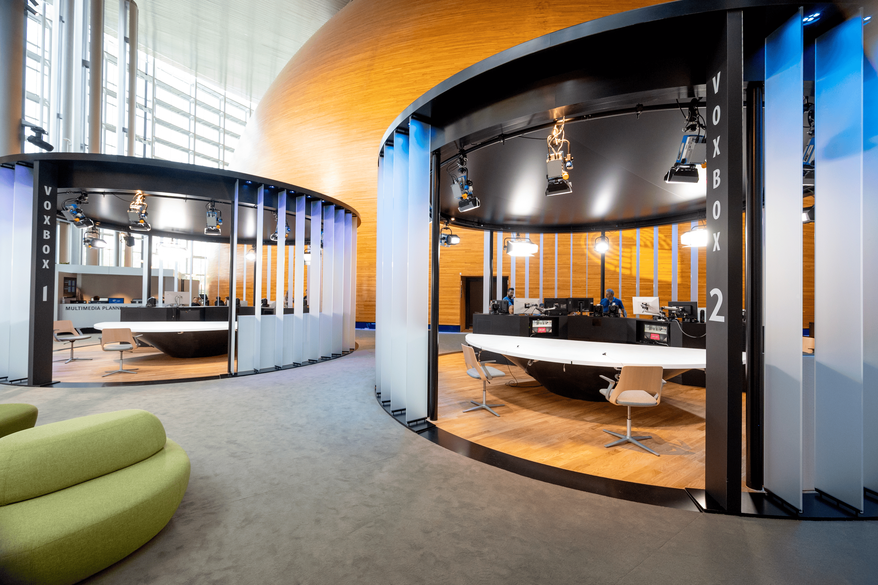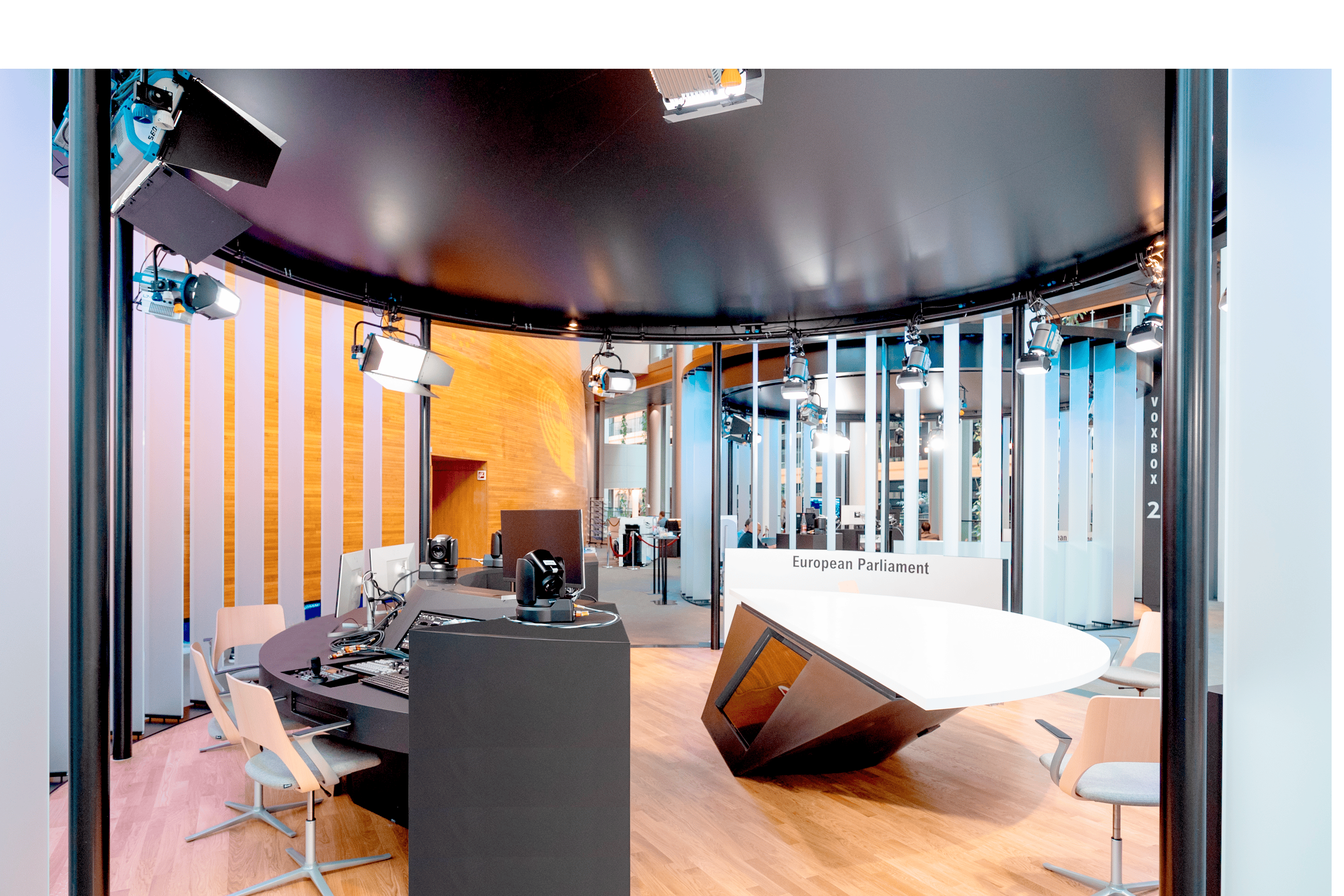 Aménagement des plateaux audiovisuels pour accès direct aux parlementaires. Création de zones MULTIMEDIA (VOXBOX, stand-up, montage, serveur, desk planning) et BROADCAST (live et mezzanine). Travaux en site occupé avec phasage spécifique pour continuité, intégration technique complète, régie intégrée et plafond acoustique.
