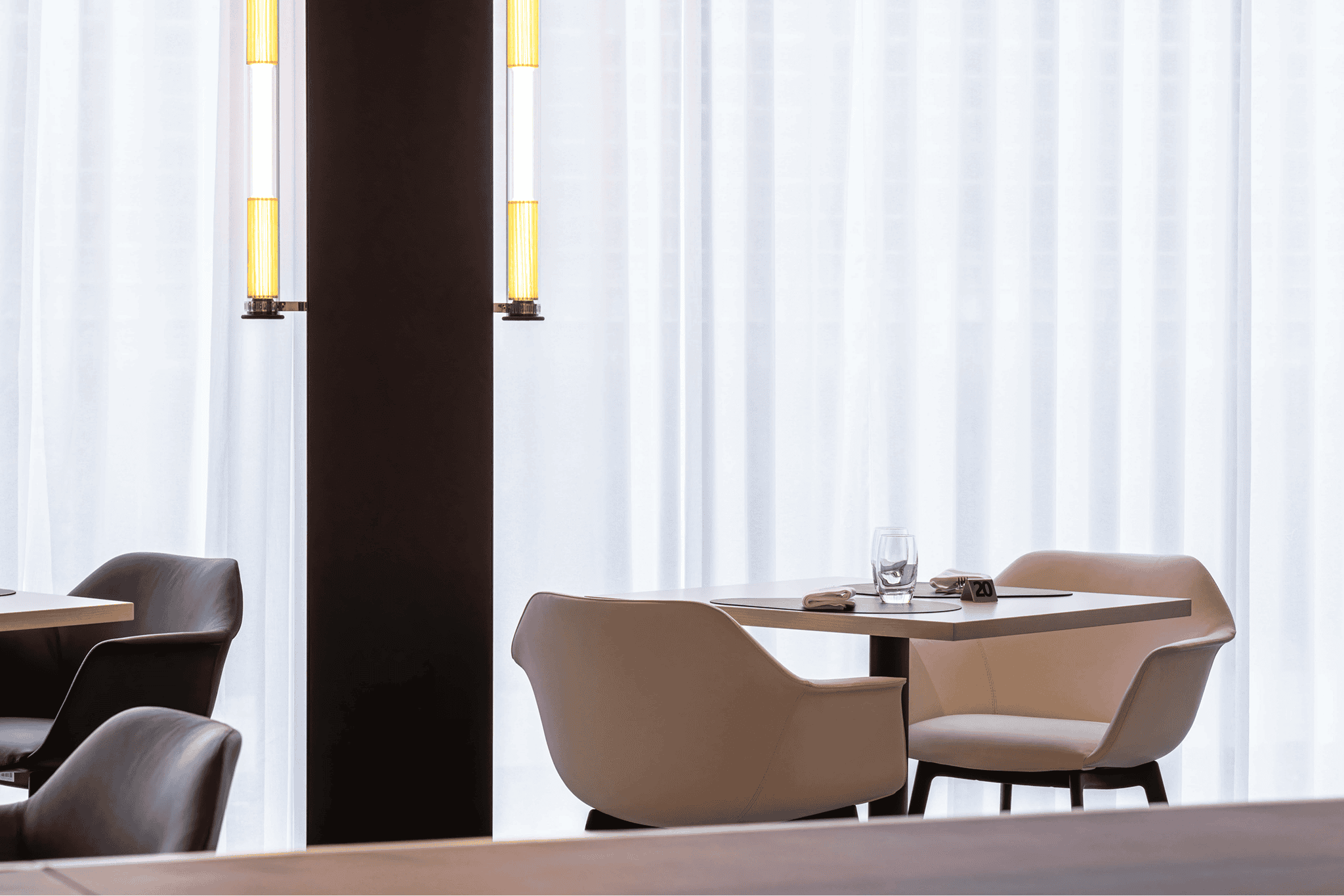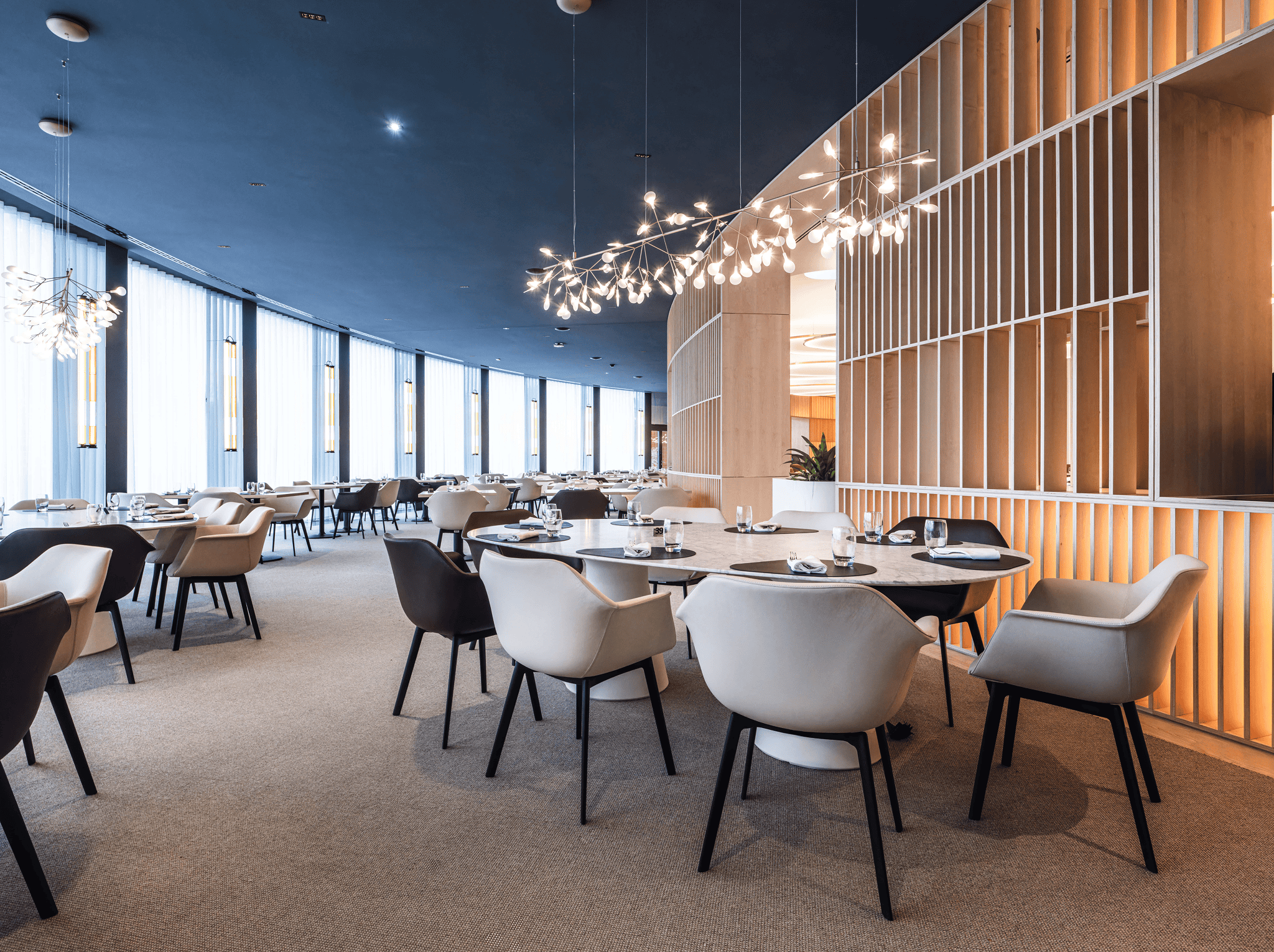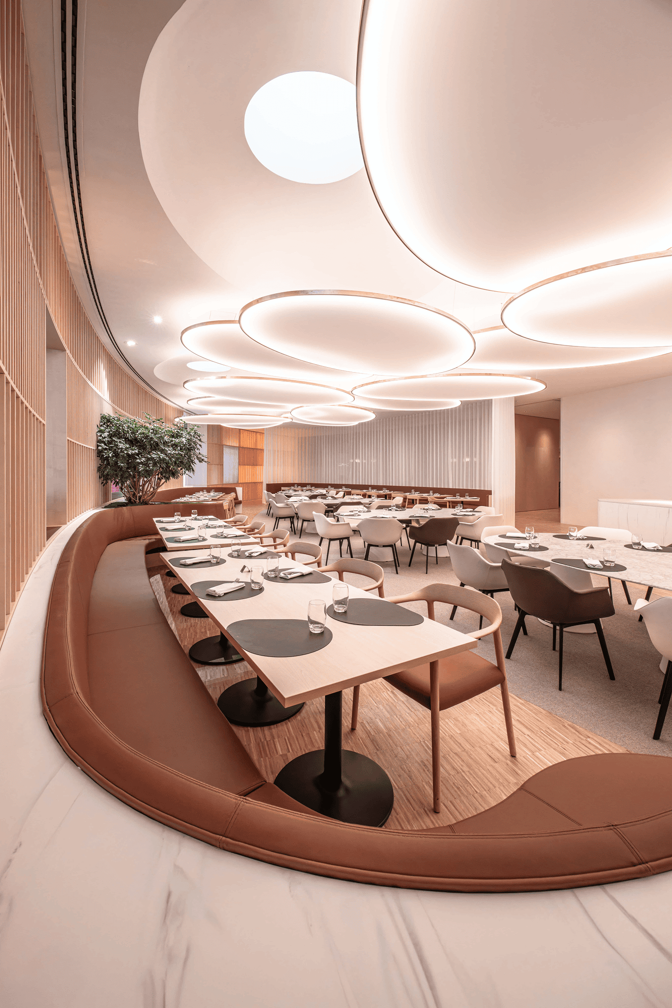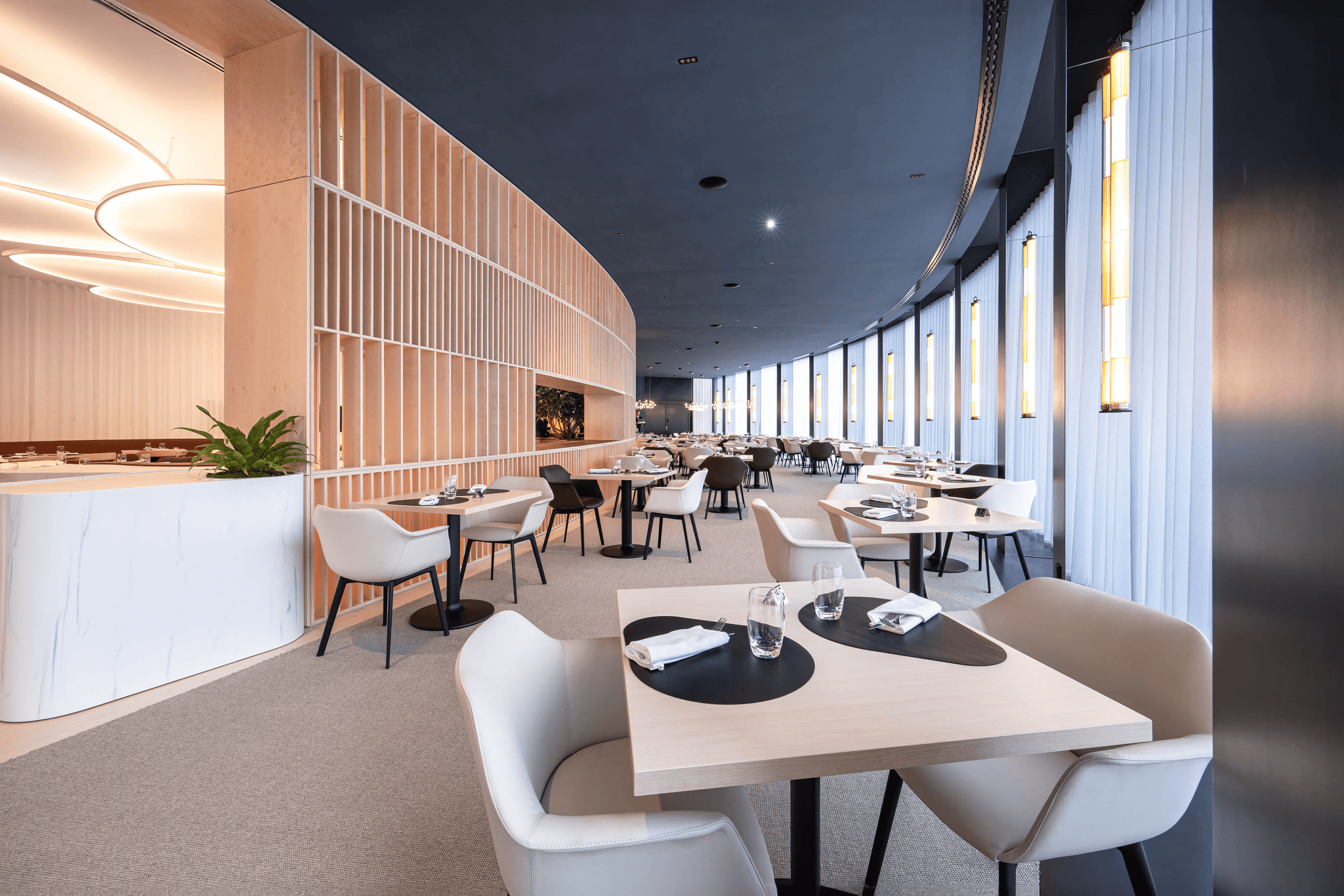 Au cœur du Parlement européen à Strasbourg, le restaurant et les salons des députés sont conçus comme un espace de représentation et d’échange. Le projet réinterprète l’architecture courbe existante par un large vitrage cintré, ouvrant les vues sur la rivière et réintroduisant une lumière naturelle structurante. Matériaux nobles, mobilier sur mesure et alcôves feutrées composent un cadre propice à la confidentialité, tandis que le traitement acoustique est intégré à l’architecture intérieure. Utilisé lors des sessions parlementaires, l’ensemble incarne une hospitalité institutionnelle exigeante, où usage, confort et représentation convergent.