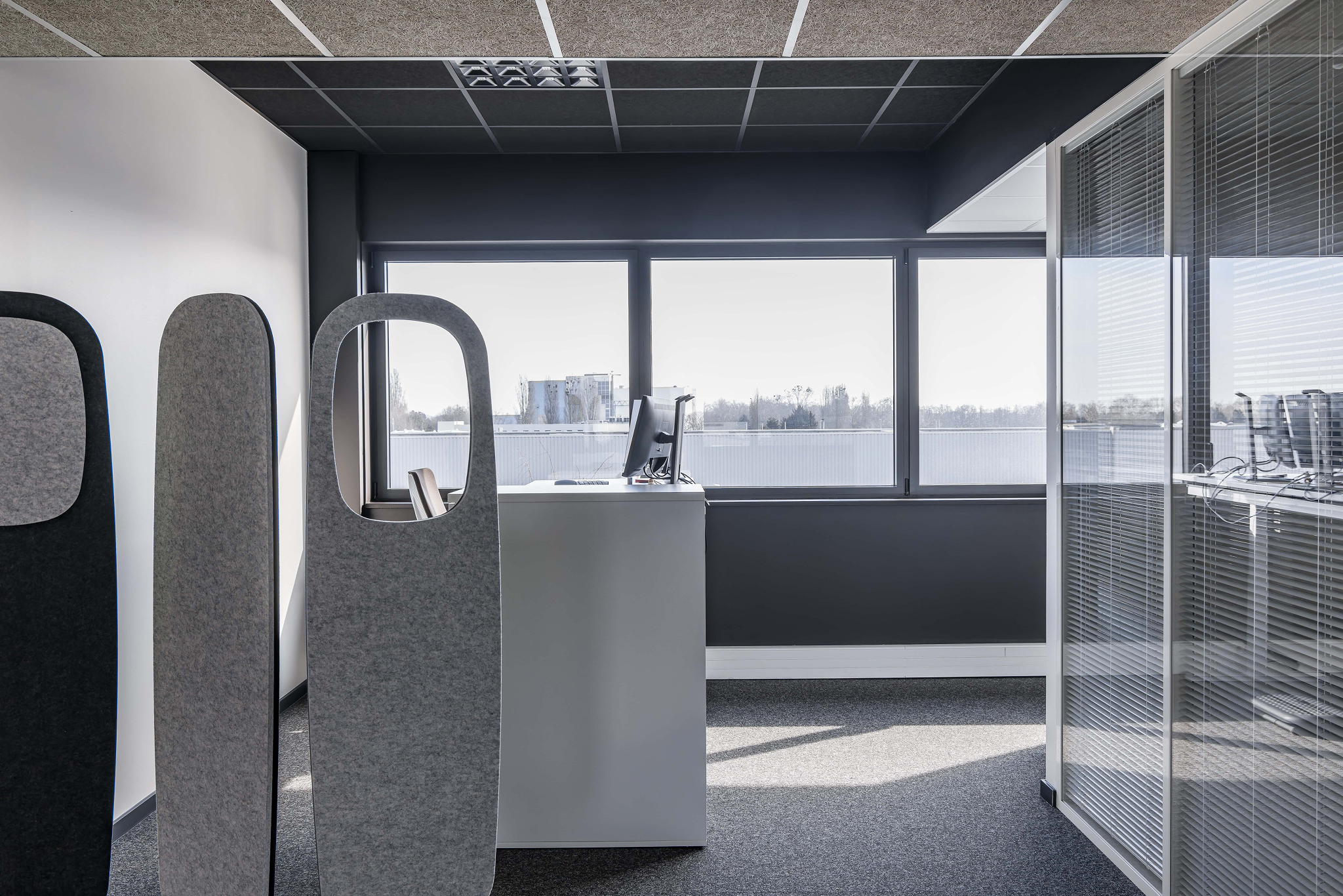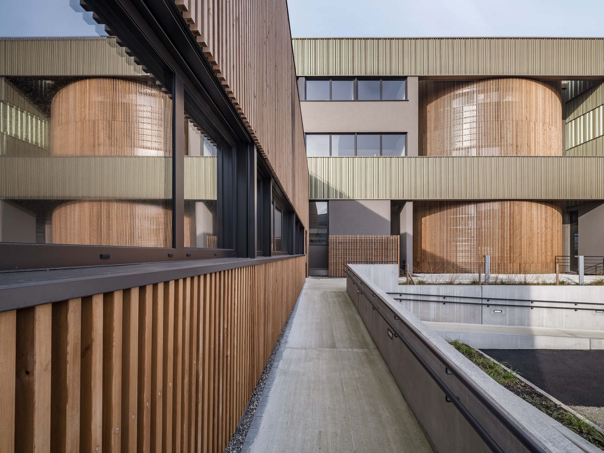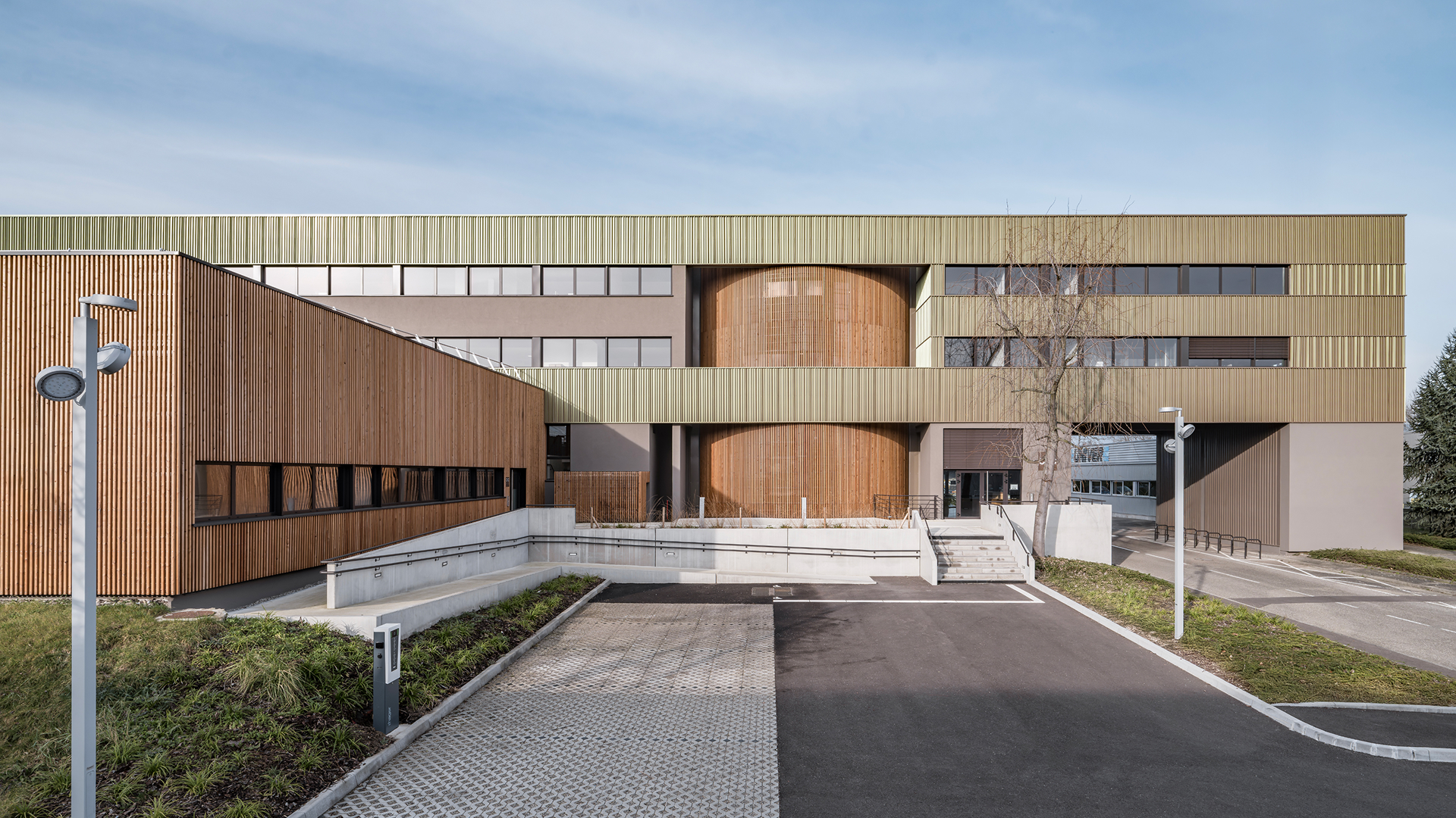 Le projet de restructuration et d’extension du siège de la CAC Colmar vise à regrouper l’ensemble des fonctions tertiaires et d’accueil sur un site unique. Il s’appuie sur la requalification de deux bâtiments existants – un immeuble de bureaux et un hangar attenant – pour créer des espaces de travail, de formation, de réunion et de convivialité. L’intervention comprend une réorganisation des volumes, une amélioration des performances énergétiques par une isolation thermique par l’extérieur et la mise en œuvre d’un bardage en terre cuite. Le projet renforce la lisibilité de l’entrée et propose une image institutionnelle contemporaine, sobre et pérenne.