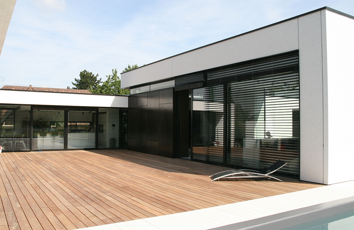 Villa autour de deux patios, ouverture sur paysage. Espaces de vie et chambres distribués sur niveaux différenciés, piscine à débordement extérieure et poolhouse. Matériaux : béton, marbre et teck. Isolation thermique optimisée, volumes sculptés par la lumière, relation harmonieuse entre intérieur et extérieur.